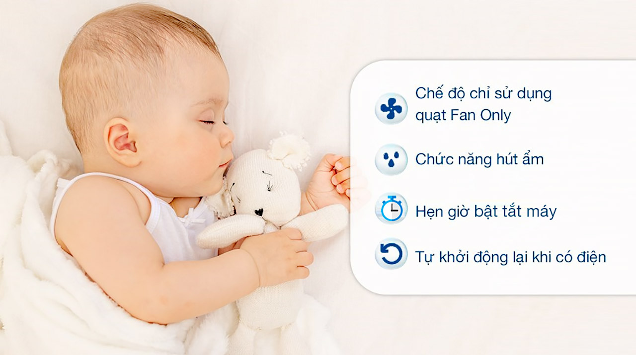 - Chức năng hút ẩm sẽ hút độ ẩm trong không khí phù hợp cho những ngày mưa hoặc độ ẩm cao.